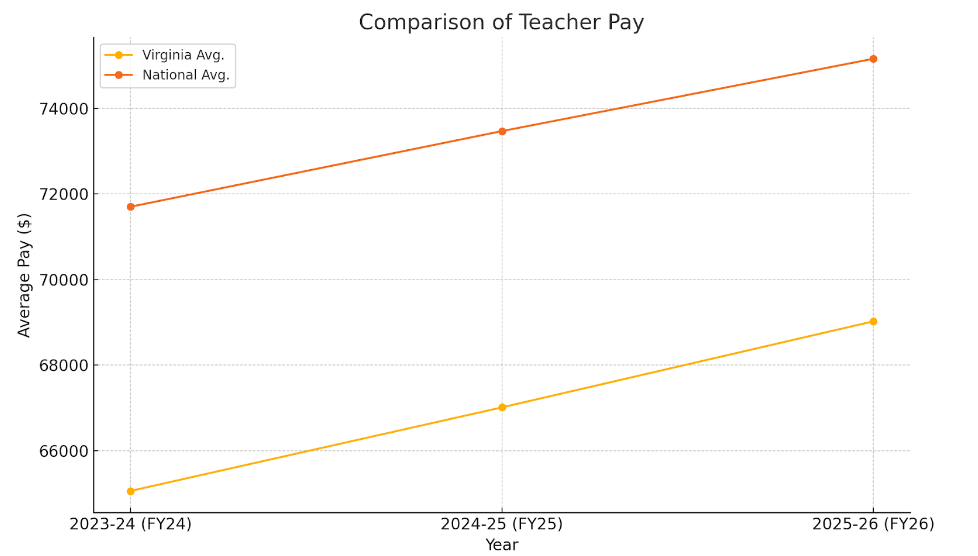 Last month, the Virginia Education Association condemned Gov. Glenn Youngkin’s veto of two bills intended to raise Virginia teacher pay to the national average. In a press release, the VEA cited data from the National Education Association showing that, contrary to Youngkin’s claims, the average VA teacher pay was indeed below the national average.