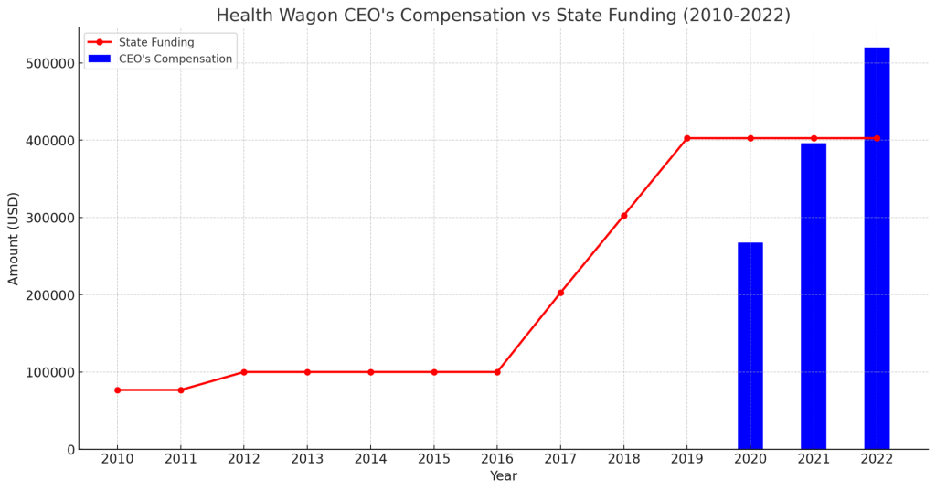 Using the numbers from this Cardinal News story, you can ask ChatGPT to create a bar graph of the Health Wagon CEO’s annual compensation compared to the amount of state funding the nonprofit received and get something like this: